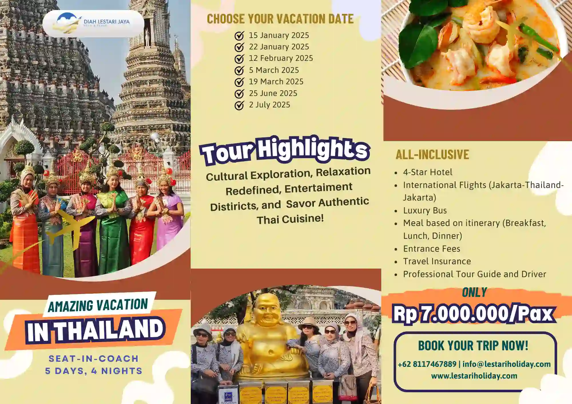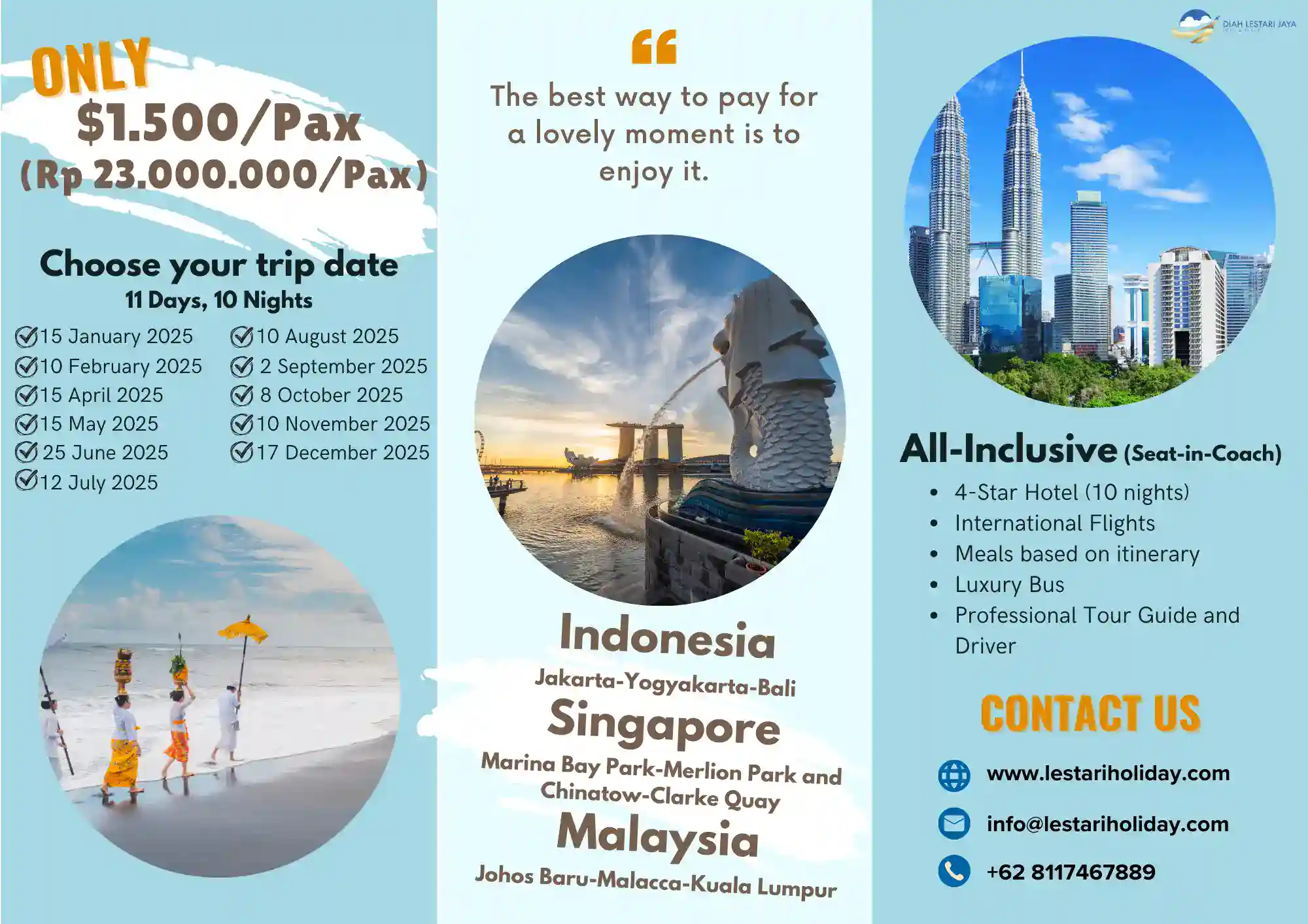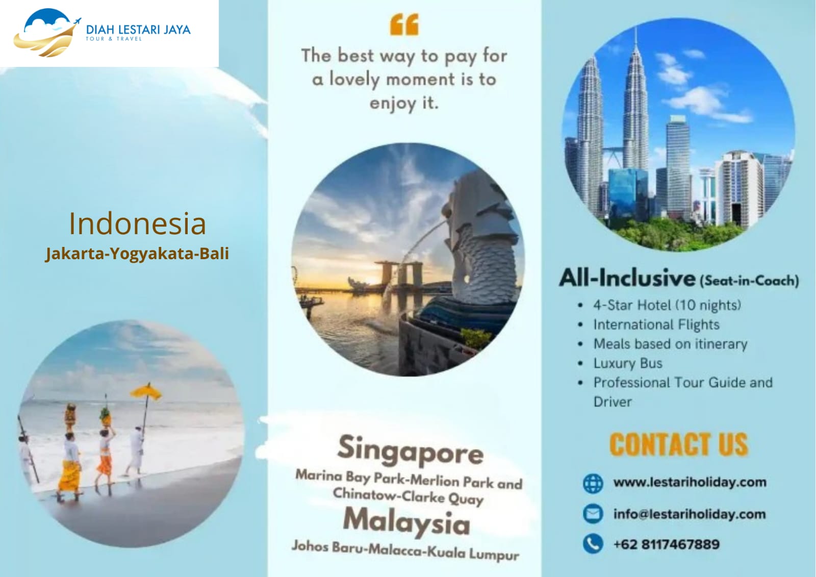Lestari Holiday was founded with a passion for delivering unforgettable travel experiences. Established on April 20, 2017, the company began as a small travel agency focused on providing domestic tour packages to local destinations in Indonesia. Over the years, Lestari Holiday expanded its reach, offering international travel packages, pilgrimage tours, and customized travel solutions for a wide variety of clients. From its humble beginnings, Lestari Holiday has grown into a trusted name in the travel industry, known for its dedication to customer satisfaction and exceptional service. Through partnerships with hotels, airlines, and local tour operators, the company has maintained its commitment to quality and affordability.
