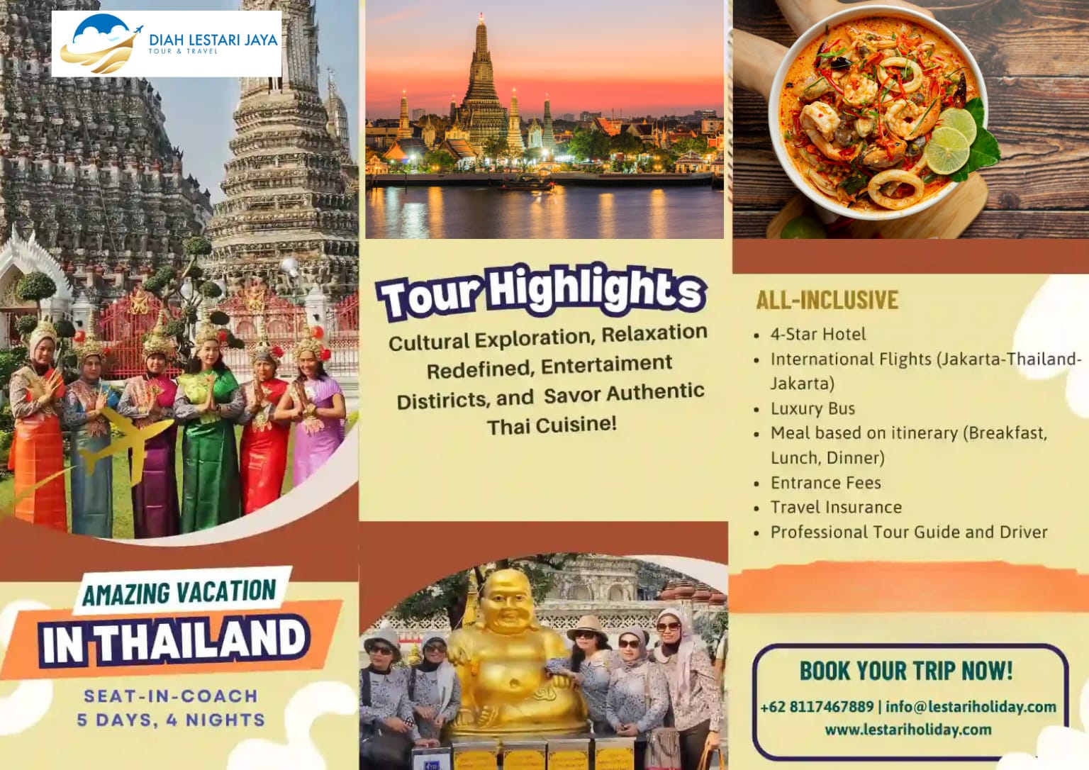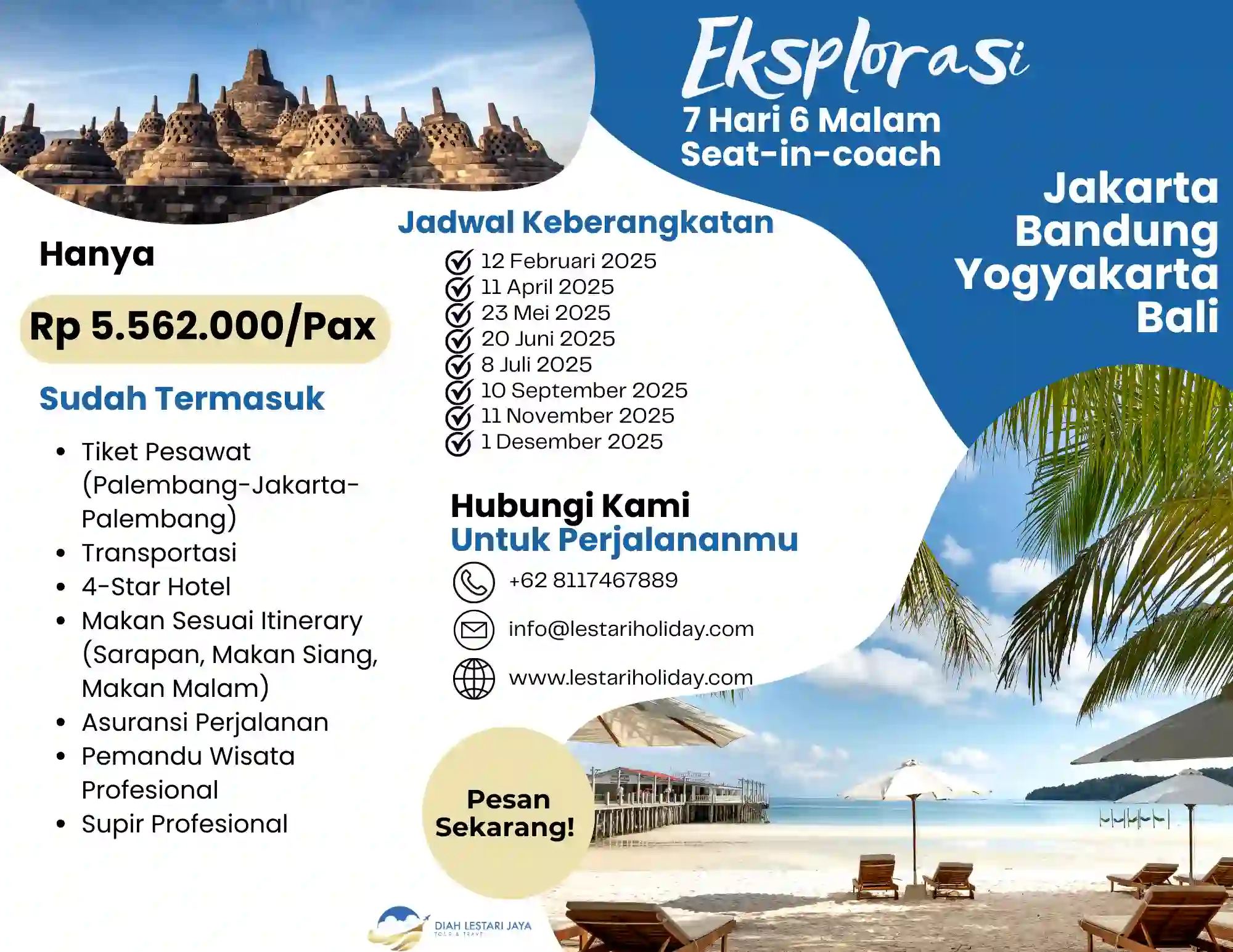 We offers domestic and international tour packages, which include transportation, accommodation, meals, and activities. These packages are often tailored for popular destinations like Bali, Yogyakarta, or international locations.